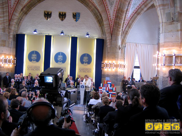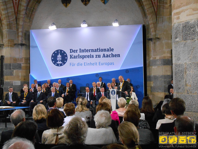 Auch bei diesem besonderen Karlspreis sorgten wir wieder für die Beschallung des Krönungssaals sowie die Übertragung per LED Wand auf Katschhof und im Elisengarten.
